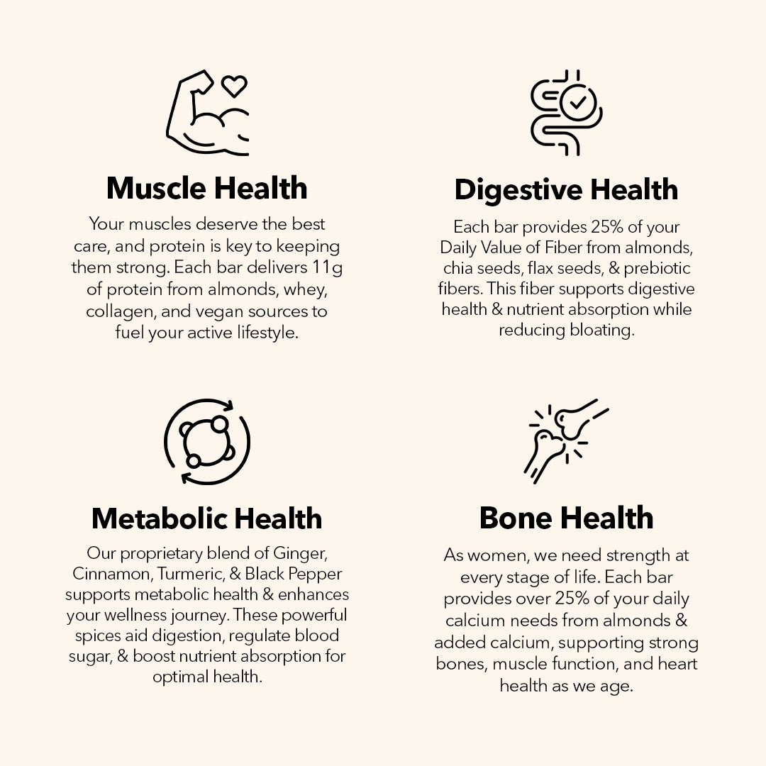 Unlike many other bars, ours is crafted with nutrient-rich, minimally processed ingredients to provide balanced nutrition without artificial additives while delivering 25% of your daily requirements of protein, fiber, calcium and vitamin D3. We're transparent about our ingredients and manufacturing process. Our bars are free from artificial sweeteners, colors, and flavors, so you know exactly what you're putting into your body.