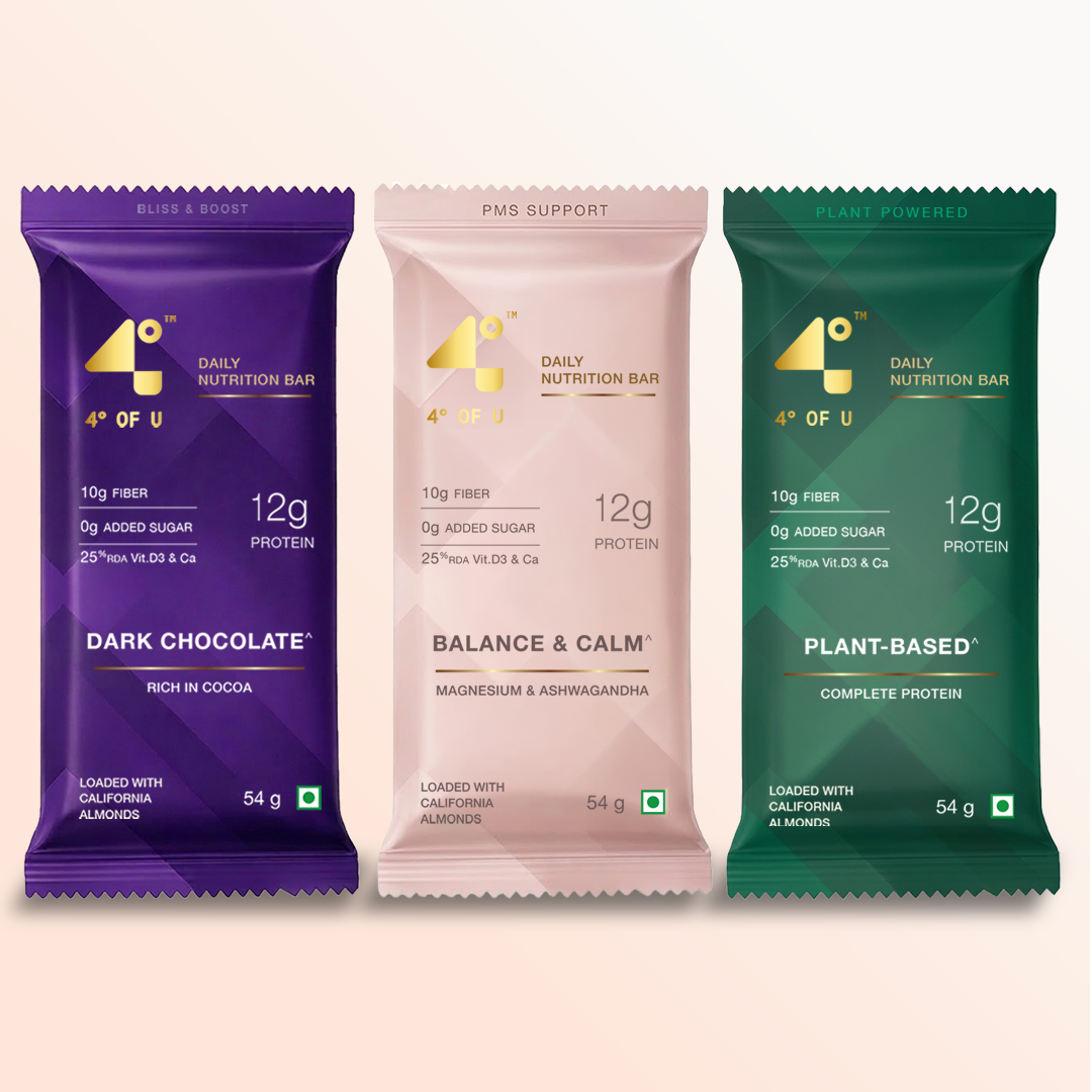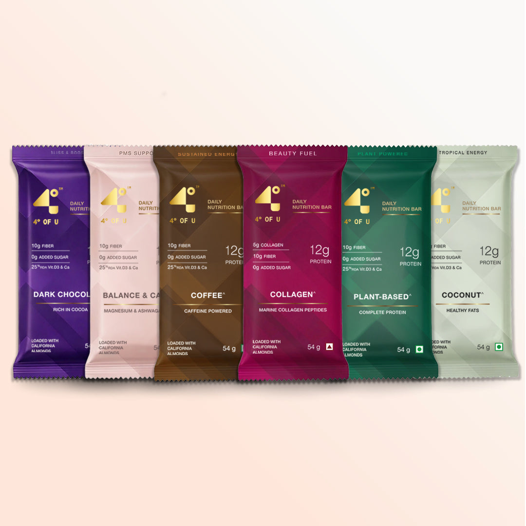 6 protein-packed bars in one box, all different flavours and benefits. Designed for Women High protein (whey or pea protein enriched), high fiber and 0g added sugar, all the while giving you complete nutrition for your metabolic, bone, muscular and hormonal health. Anti-inflammatory Science-backed blend of Turmeric & Ginger help manage your body's inflammation levels. Black pepper ensures you absorb the Curcumin from the Turmeric better. Stronger Bones Enriched with 25% of your daily dose of Calcium & Vitamin D3, critical for bone health & immunity. Digestive Fiber Whole Chia & Flax seeds are the fiber powerhouses in every bar which work to keep your digestive track moving. This pack contains: • 1x Original Protein Bar 63g • 1x Plant Based Protein Bar 63g • 1x Coconut Protein Bar 63g • 1x Dark Chocolate Protein Bar 63g • 1x Collagen Protein Bar 63g • 1x PMS Protein Bar 63g