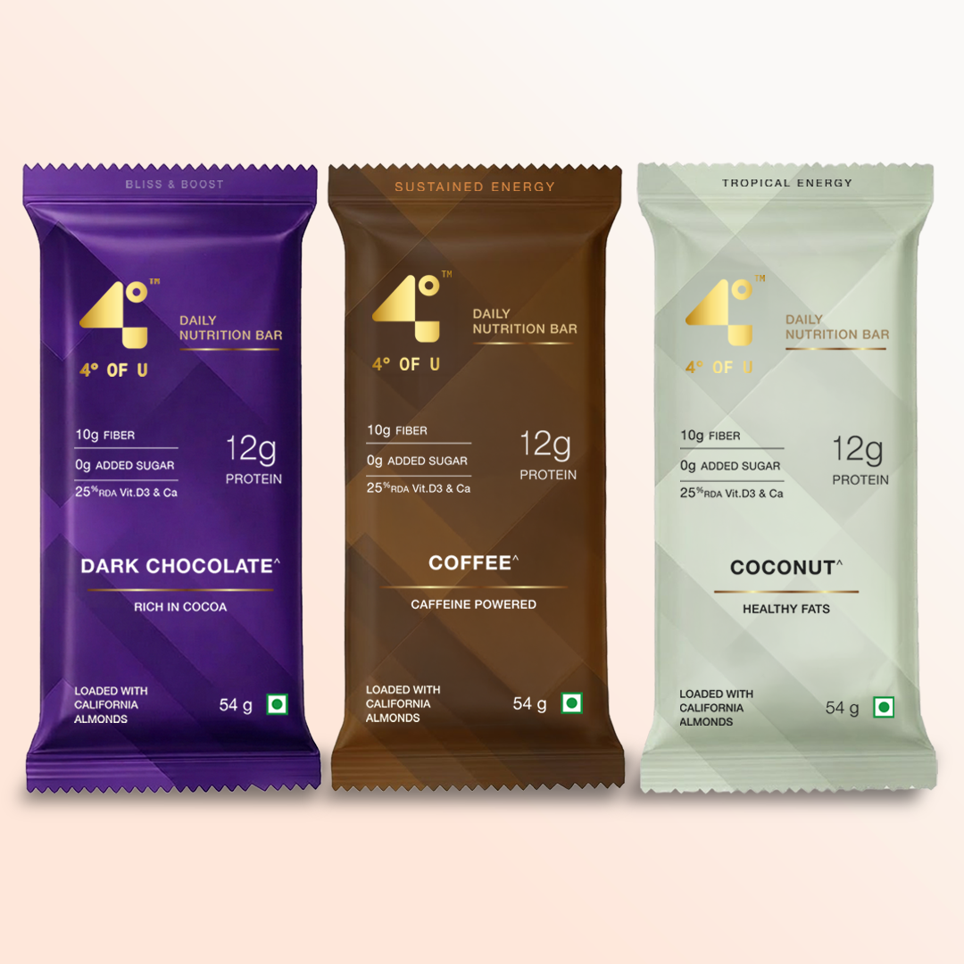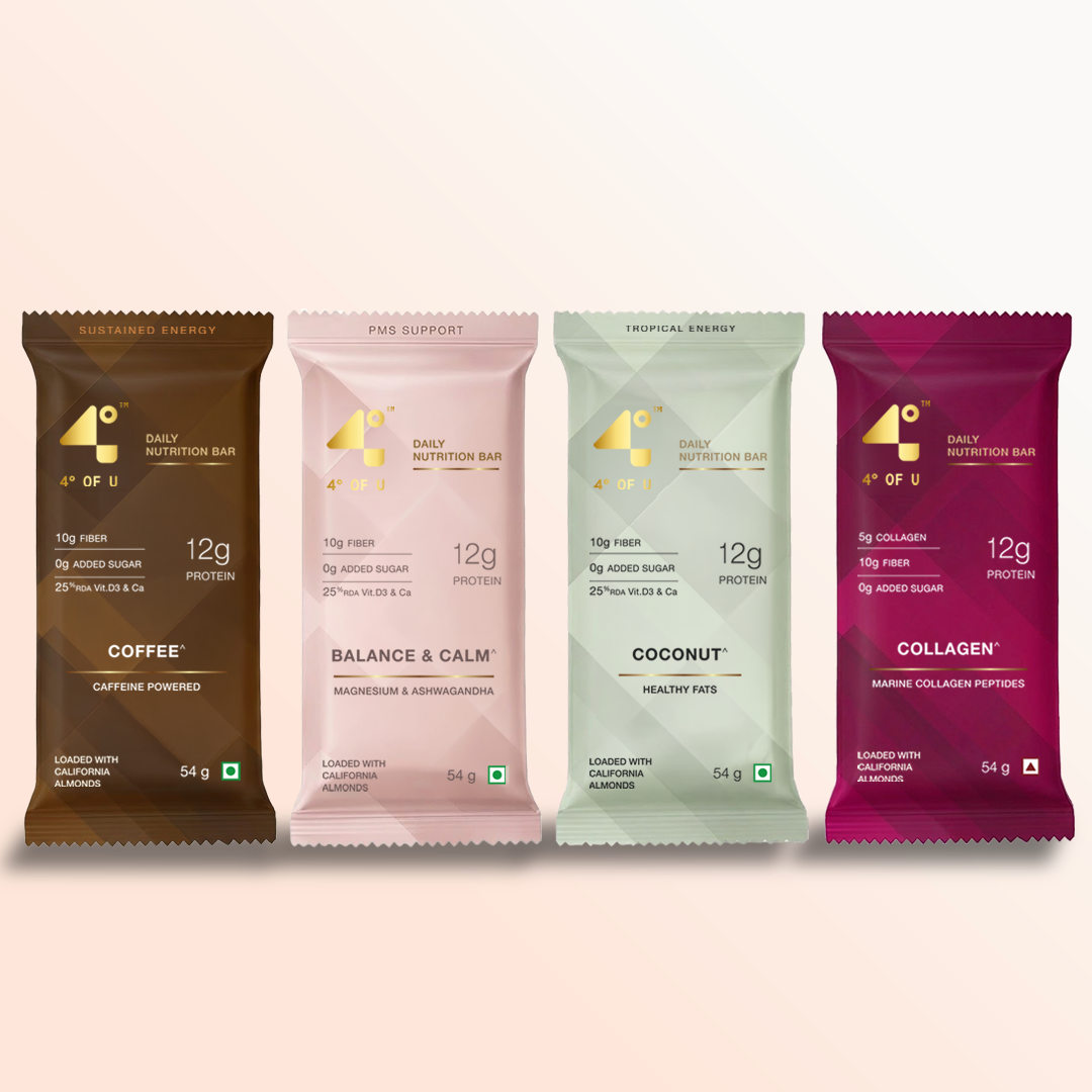 Made to support hormonal balance, Meno Grace blends ashwagandha & magnesium for mood support during PMS. Hormone & Mood Regulation One of the best protein bars for bloating, fatigue, and PMS relief. Perhaps the only protein bar in India with added Ashwagandha, Magnesium and B6, the 4DU Meno Grace helps to ease PMS, fatigue, mood shifts and cortisol spikes. Designed for Women High protein (15g), high fiber and 0g added sugar, all the while giving you complete nutrition for your metabolic, bone, muscular and hormonal health. Anti-inflammatory Science-backed blend of Turmeric & Ginger help manage your body's inflammation levels. Black pepper ensures you absorb the Curcumin from the Turmeric better. Stronger Bones Enriched with 25% of your daily dose of Calcium & Vitamin D3, critical for bone health & immunity. Digestive Fiber Whole Chia & Flax seeds are the fiber powerhouses in every bar which work to keep your digestive track moving.