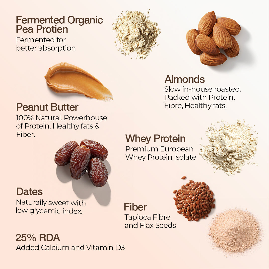 Almonds, Peanut Butter, Dates, Fructo-Oligosaccharides (Prebiotic Fiber), Whey Protein Isolate, Humectant (Glycerin), Pea Protein Concentrate, Calcium Carbonate, Chia Seeds, Flax Seeds, Ginger Powder, Cinnamon Powder, Rosemary Extract, Magnesium Glycinate, Ashwagandha, Mixed Tocopherols, Turmeric Powder, Edible Common Salt, Black Pepper, Vitamin D3 (Veg Lichen).