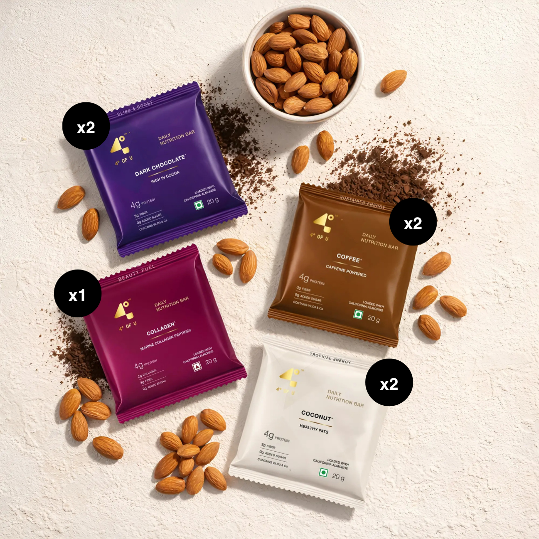 6 protein-packed minis in one box, all different flavours and benefits. Each 21g mini packs almonds, protein, fiber, calcium, and vitamin D3. Strength, energy, and balance in every bite. Designed for Women High protein (whey or pea protein enriched), high fiber and 0g added sugar, all the while giving you complete nutrition for your metabolic, bone, muscular and hormonal health. Anti-inflammatory Science-backed blend of Turmeric & Ginger help manage your body's inflammation levels. Black pepper ensures you absorb the Curcumin from the Turmeric better. Stronger Bones Enriched with 25% of your daily dose of Calcium & Vitamin D3, critical for bone health & immunity. Digestive Fiber Whole Chia & Flax seeds are the fiber powerhouses in every bar which work to keep your digestive track moving. This pack contains 6 x 21g mini bars: 1 Original, 1 Meno Grace, 1 Collagen, 1 Dark Chocolate, 1 Coconut & 1 Plant Based. For more details, please visit individual flavour pages.